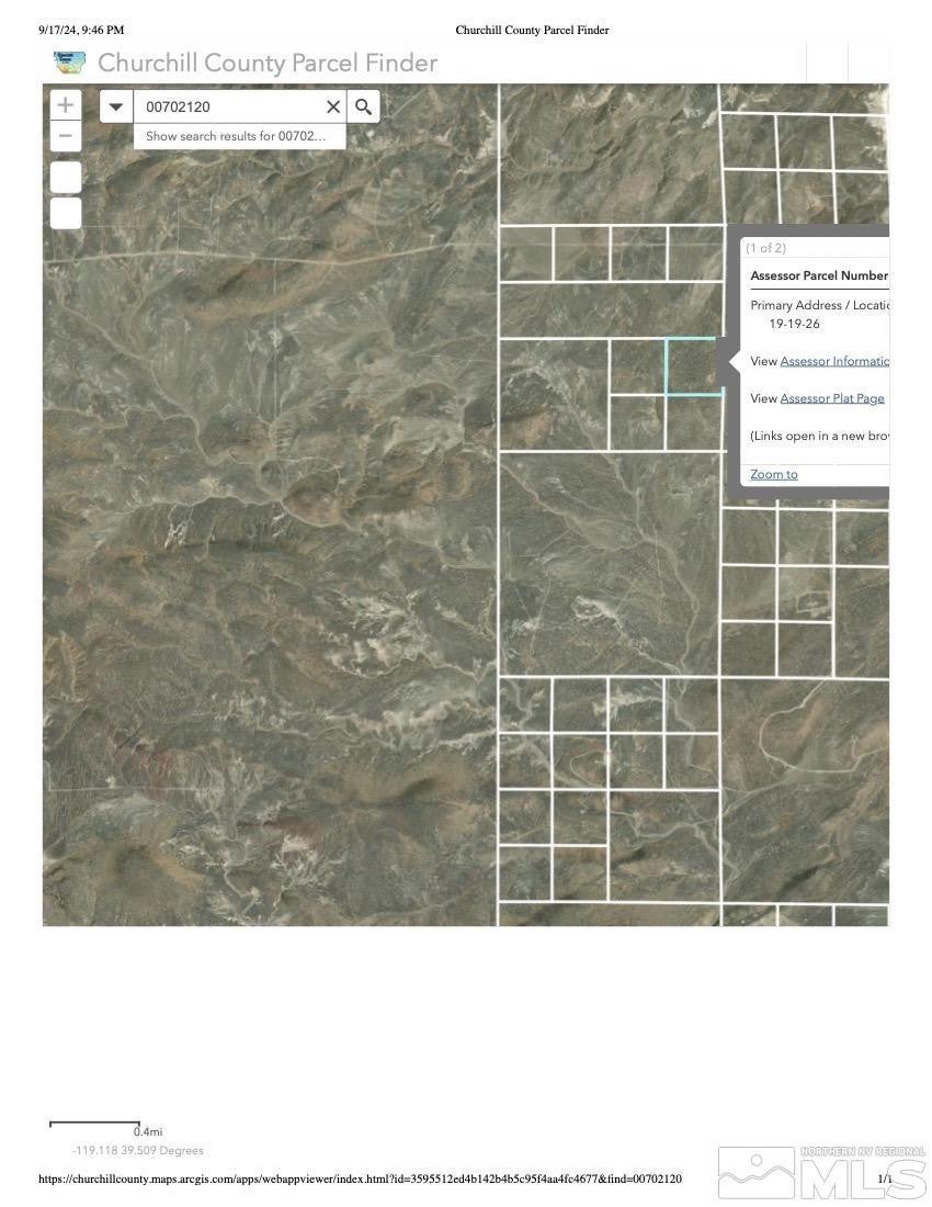 40 acres located South west of Churchill County. Great lot to have privacy or off grid living. Directions to see the land. Lat 39.495342 /Lon -119.101502 Or download the app landguide and type in the APN number 007-021-20