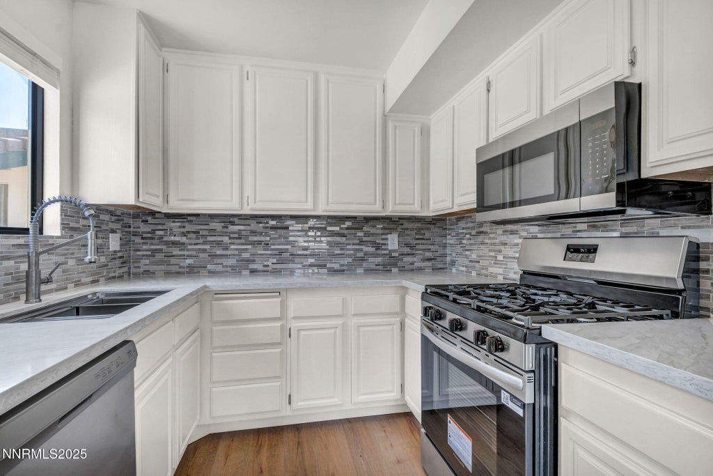 Modern elegance meets condo living at its finest in this fully renovated 2-bedroom, 1.5-bath home in Sparks. The living room showcases a stunning floor-to-ceiling tiled fireplace with mantel, while the kitchen offers granite countertops, tiled backsplash, farmhouse sink, and brand-new appliances—perfect for any home chef. The bathroom has been fully remodeled, adding a modern pop with stylish tile, sleek new vanities, updated toilets, and beautiful shower glass that creates a spa-like, luxurious feel. New hardware throughout the entire home completes the polished design. Every inch has also been thoughtfully refreshed with all new luxury vinyl plank flooring and fresh paint throughout, ensuring a move-in-ready experience. Step outside to your private deck and enjoy a morning cup of coffee in a quiet setting. A spacious two-car garage with newer garage door provides plenty of room for vehicles or extra storage. Perfectly situated in Sparks, the home is close to dining, shopping at The Galleria, and outdoor recreation at the Sparks Marina. The community is highly sought after and offers excellent amenities. This condo is truly spectacular—you won't want to miss your opportunity to make it your worry-free purchase today.